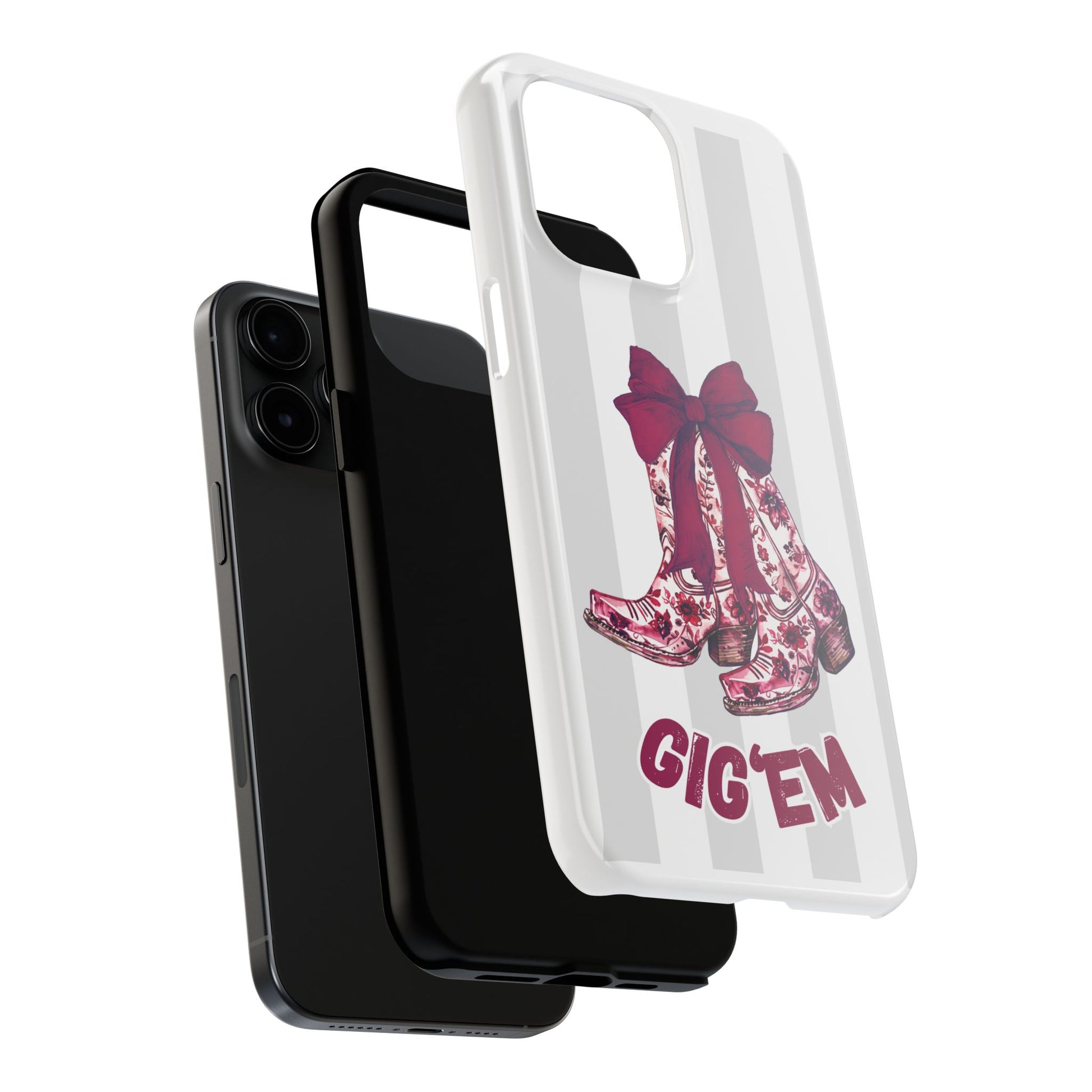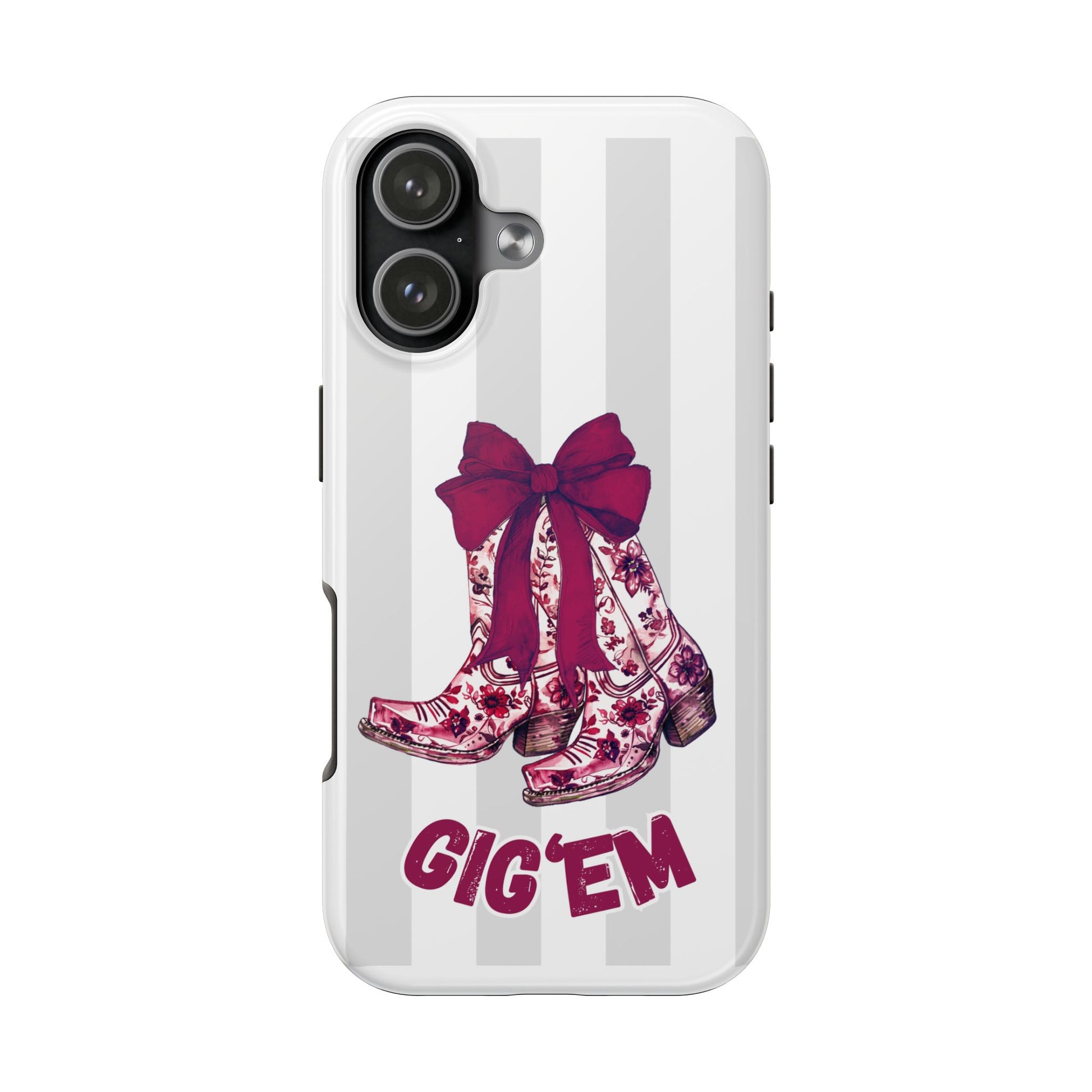 Show off your Aggie spirit and your girly side with this adorable Gig ’Em cowgirl boots phone case. Featuring a pair of floral western boots tied with a bold maroon bow, this design brings the perfect blend of Texas charm and game-day pride.