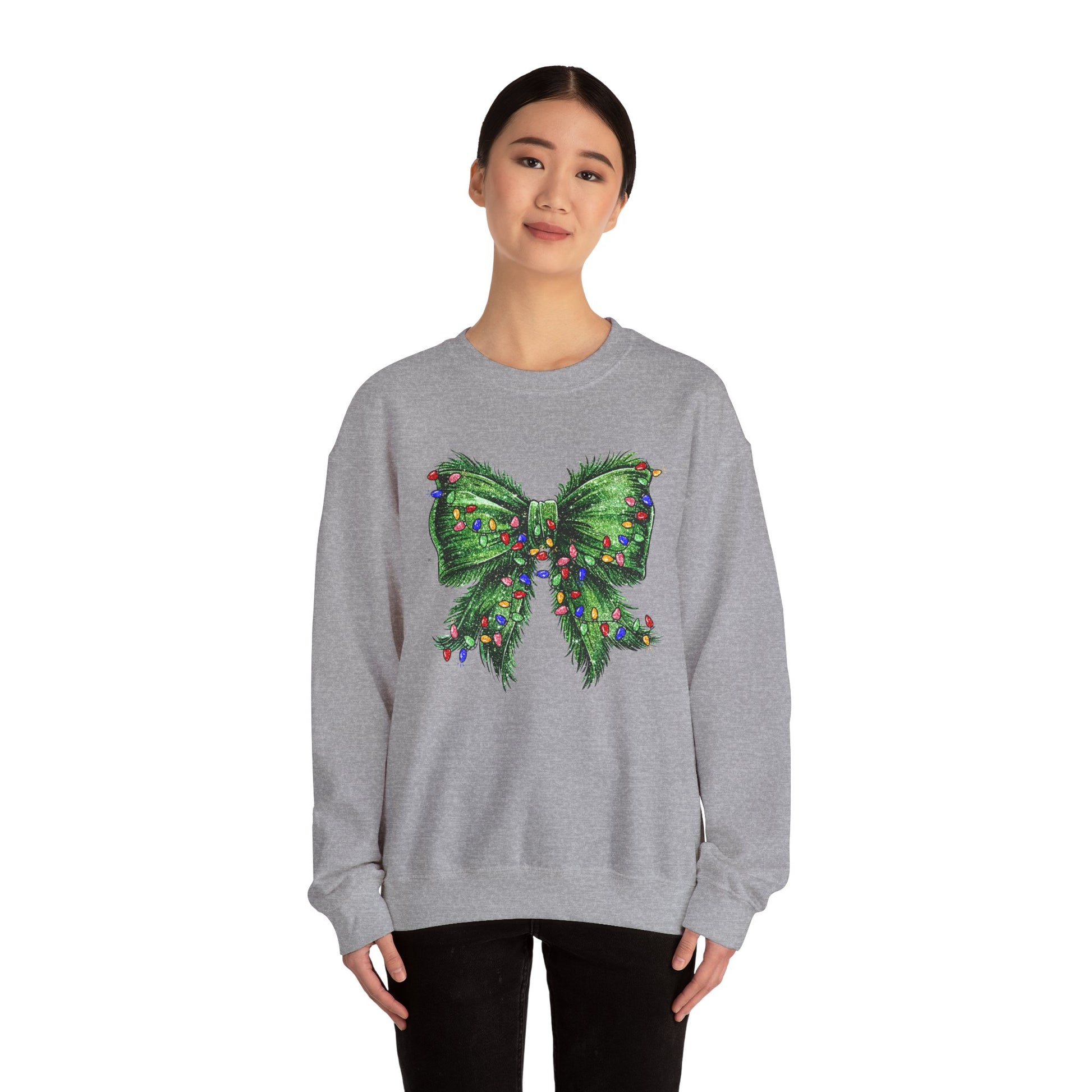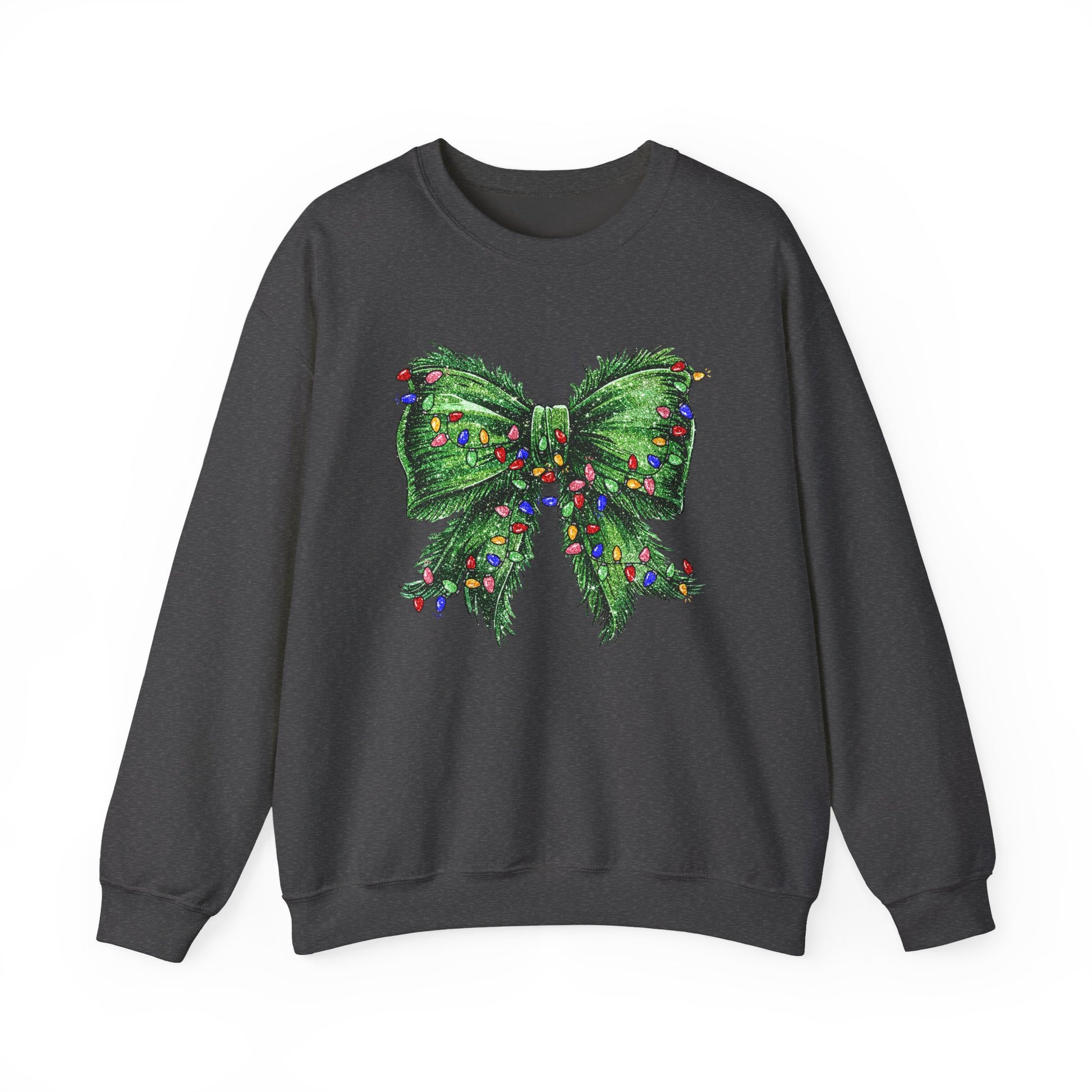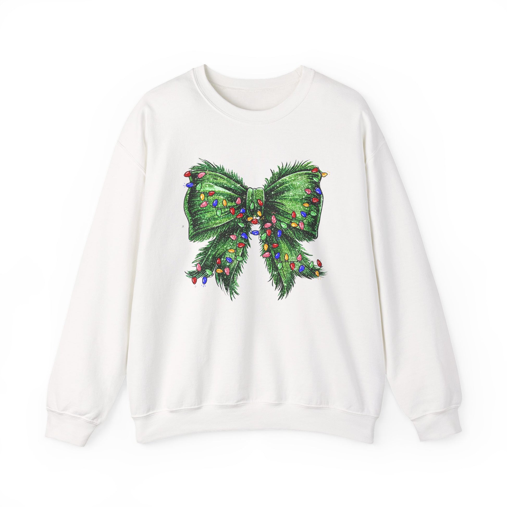 Brighten up your holiday season with this festive Christmas bow sweatshirt! Featuring a gorgeous green bow wrapped in colorful twinkle lights, this cozy crewneck is perfect for anyone who loves bold, cheerful holiday designs.