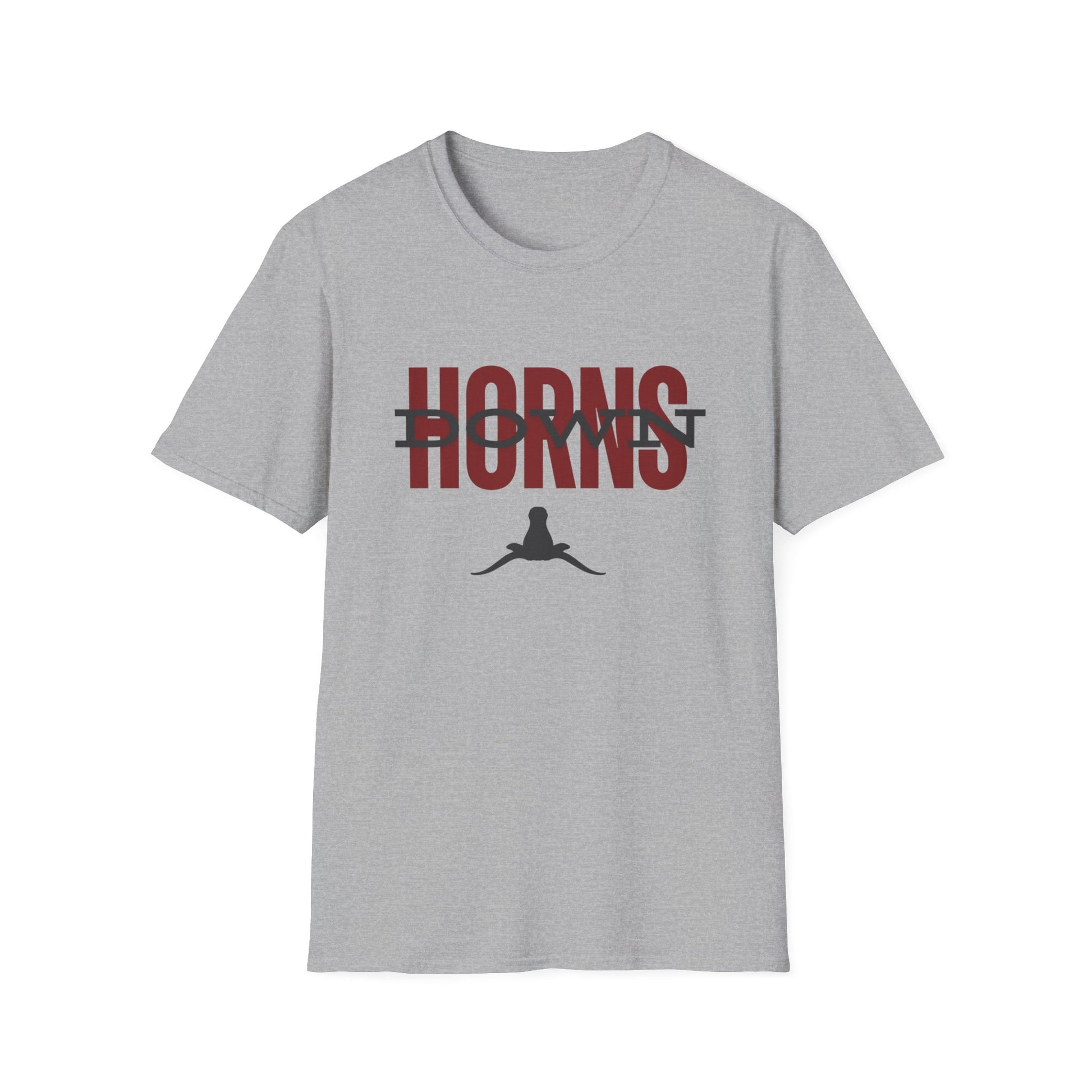 Rep your team loud and proud with this bold Horns Down Tee — the perfect rivalry shirt for game days, tailgates, and everyday smack talk. Featuring a clean, modern graphic with HORNS in maroon and the iconic horns-down silhouette, this tee delivers the ultimate statement without saying a word.
