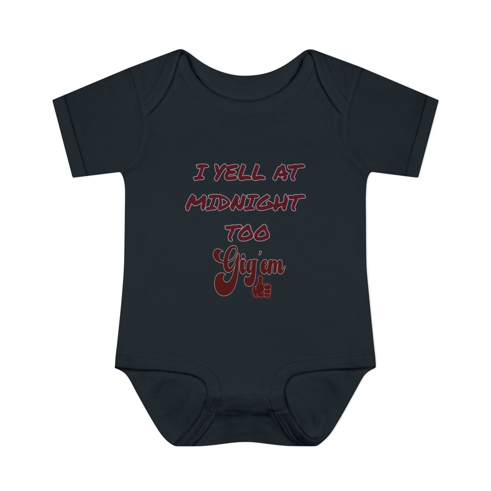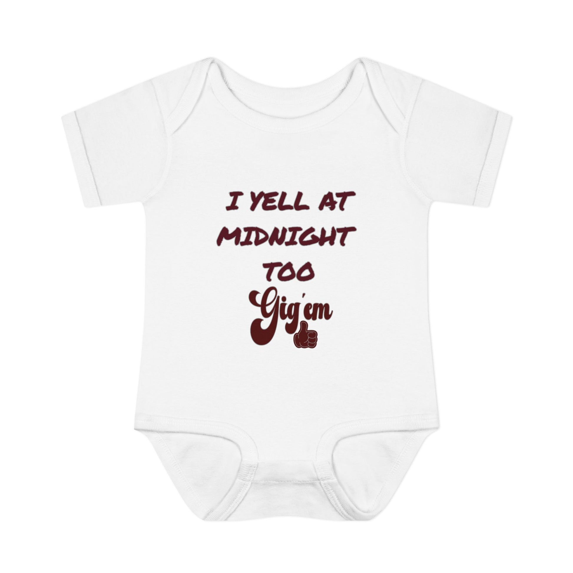 Your tiniest Aggie fan can join the tradition early with this adorable “I Yell at Midnight Too” baby bodysuit! Perfect for little ones who already love late-night wiggles and giggles, this soft and comfy infant one-piece brings Aggie spirit to every nap, playdate, and midnight meltdown.
