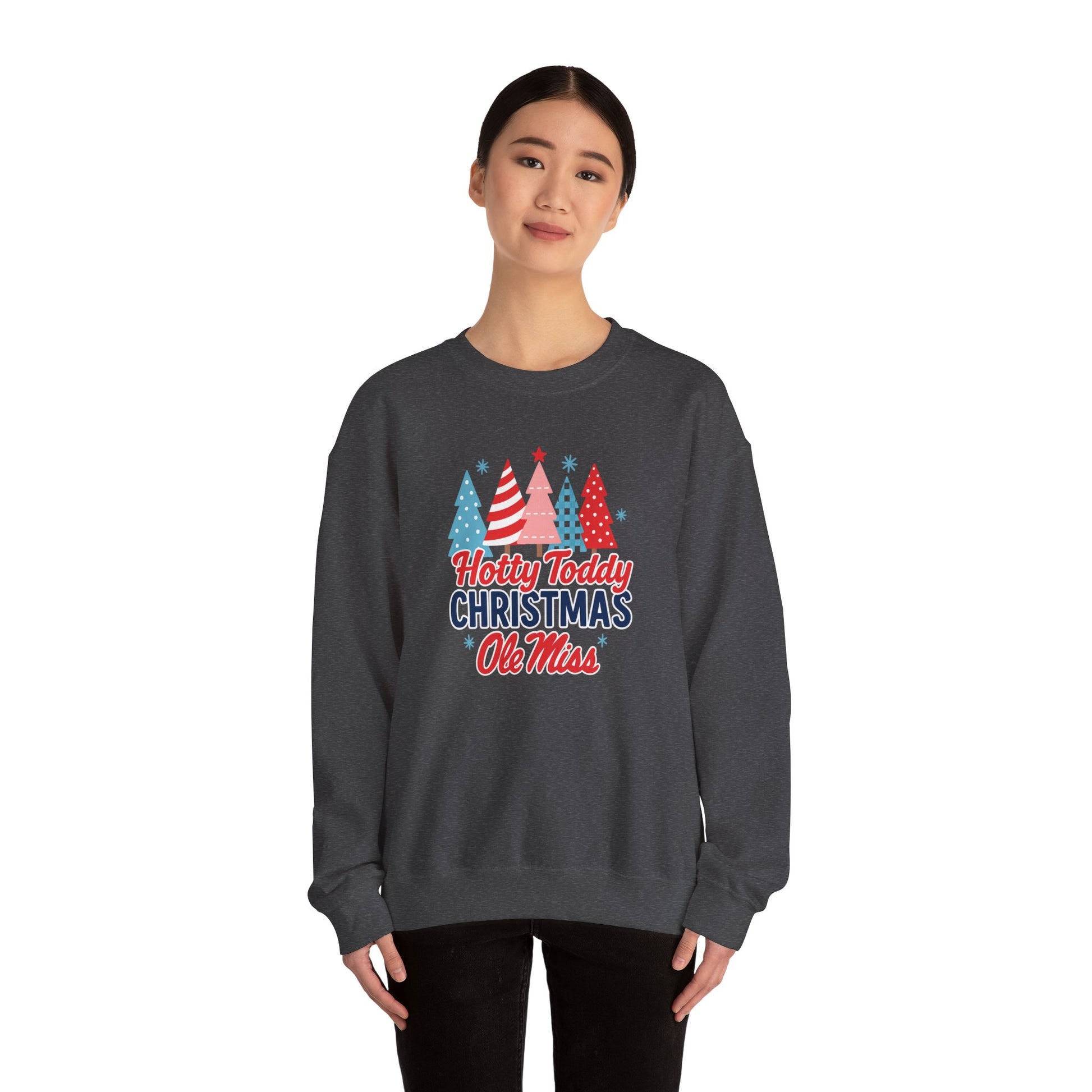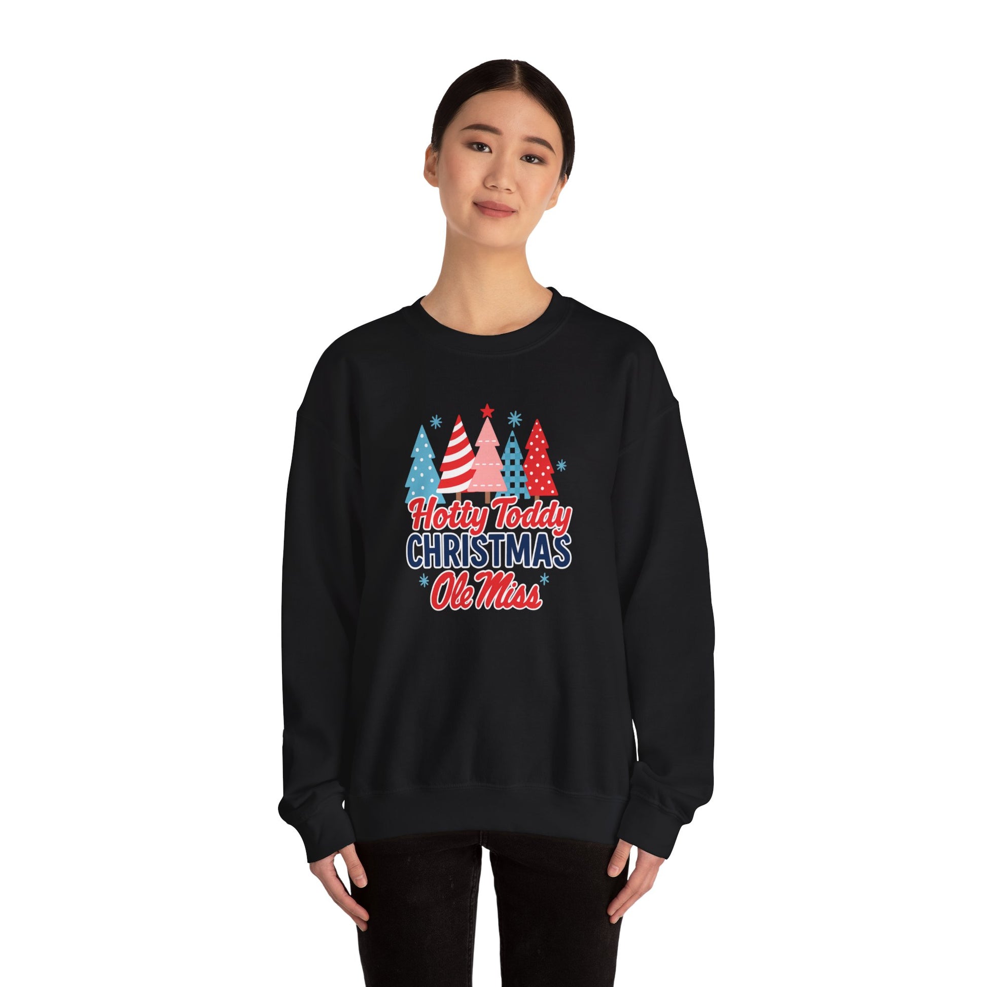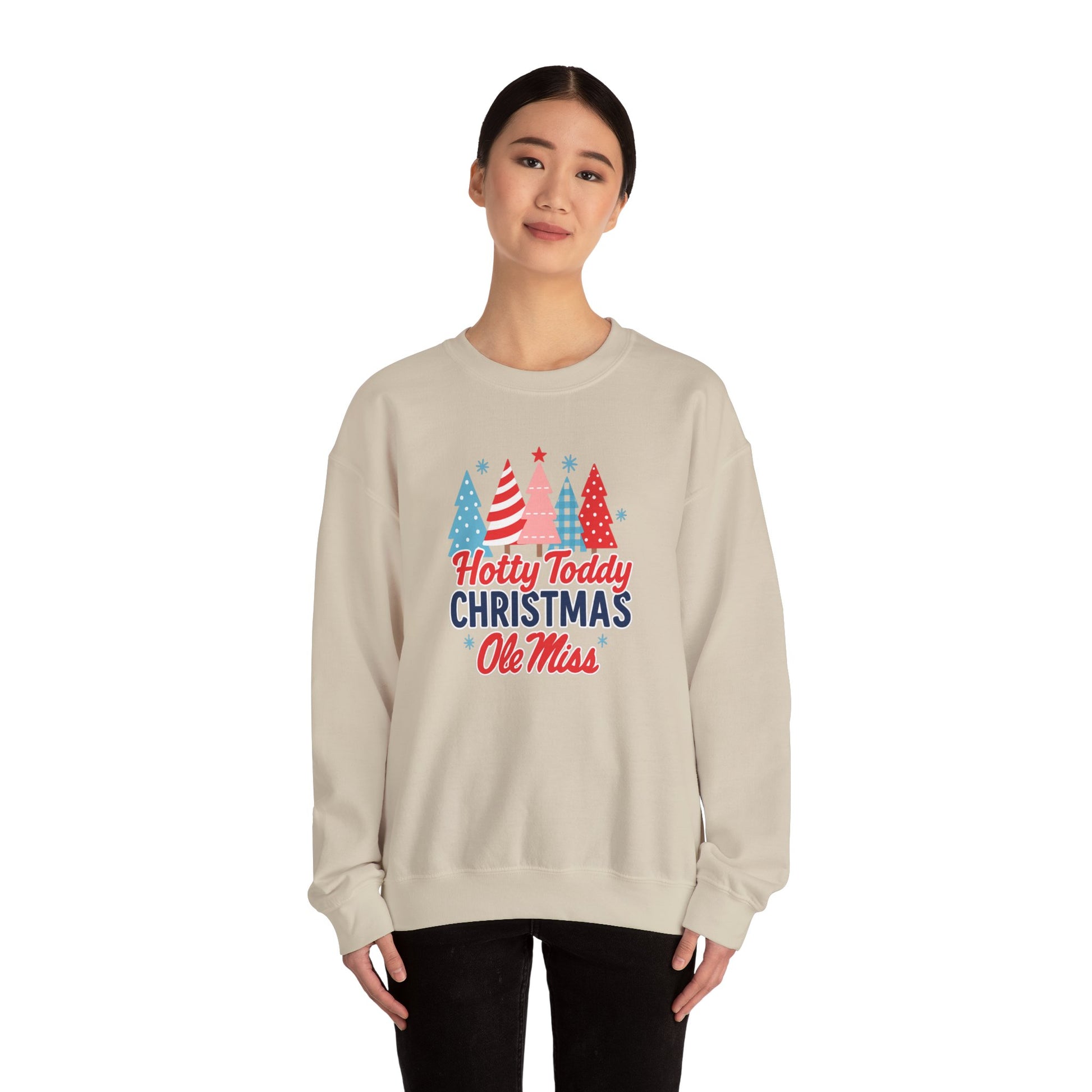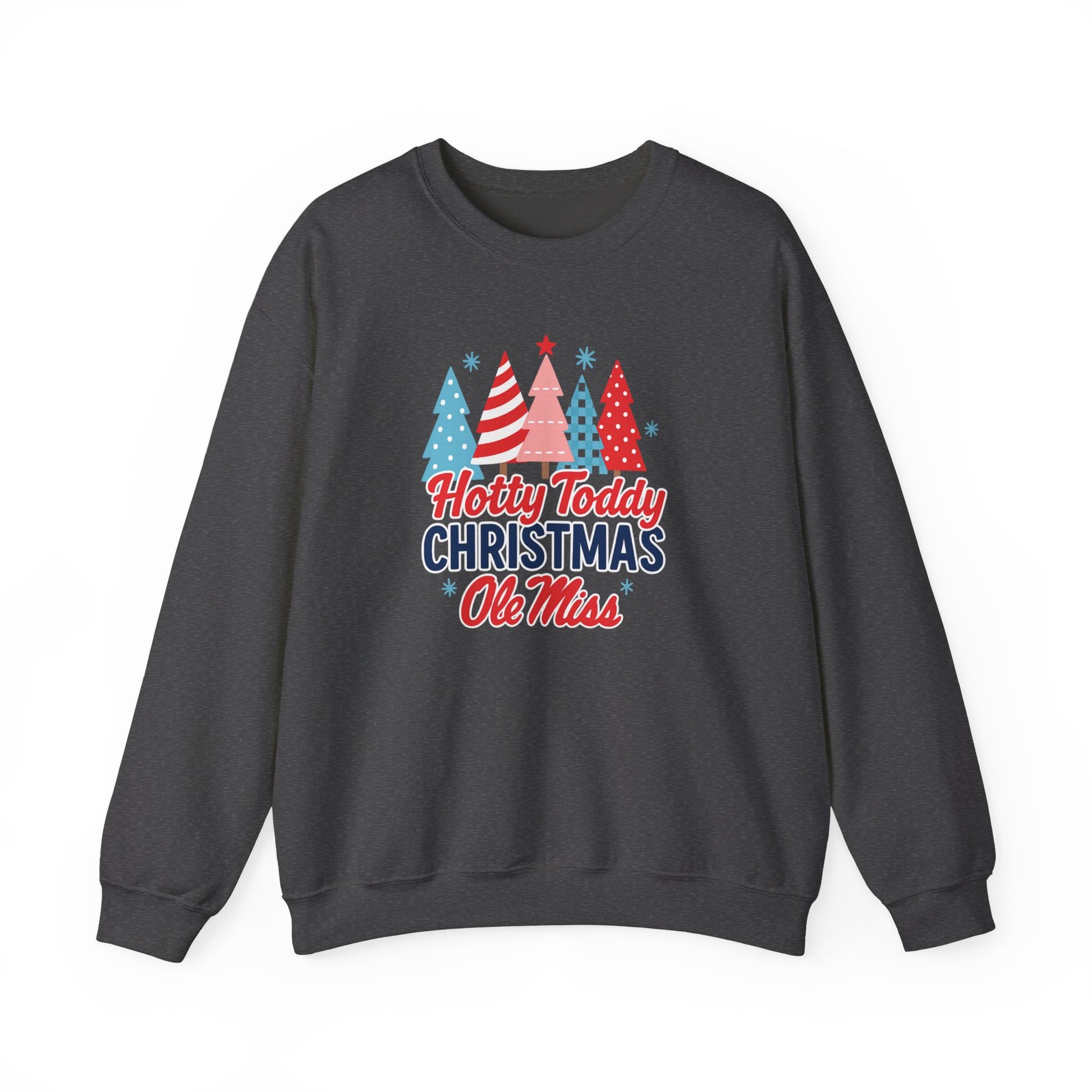 Bring Rebel spirit into the holiday season with this Ole Miss Hotty Toddy Christmas crewneck sweatshirt! Featuring a lineup of festive pastel Christmas trees in fun patternsâpolka dots, stripes, and checkeredâthis cheerful design is paired with bold âHotty Toddy Christmasâ lettering and the iconic Ole Miss script in red and blue.