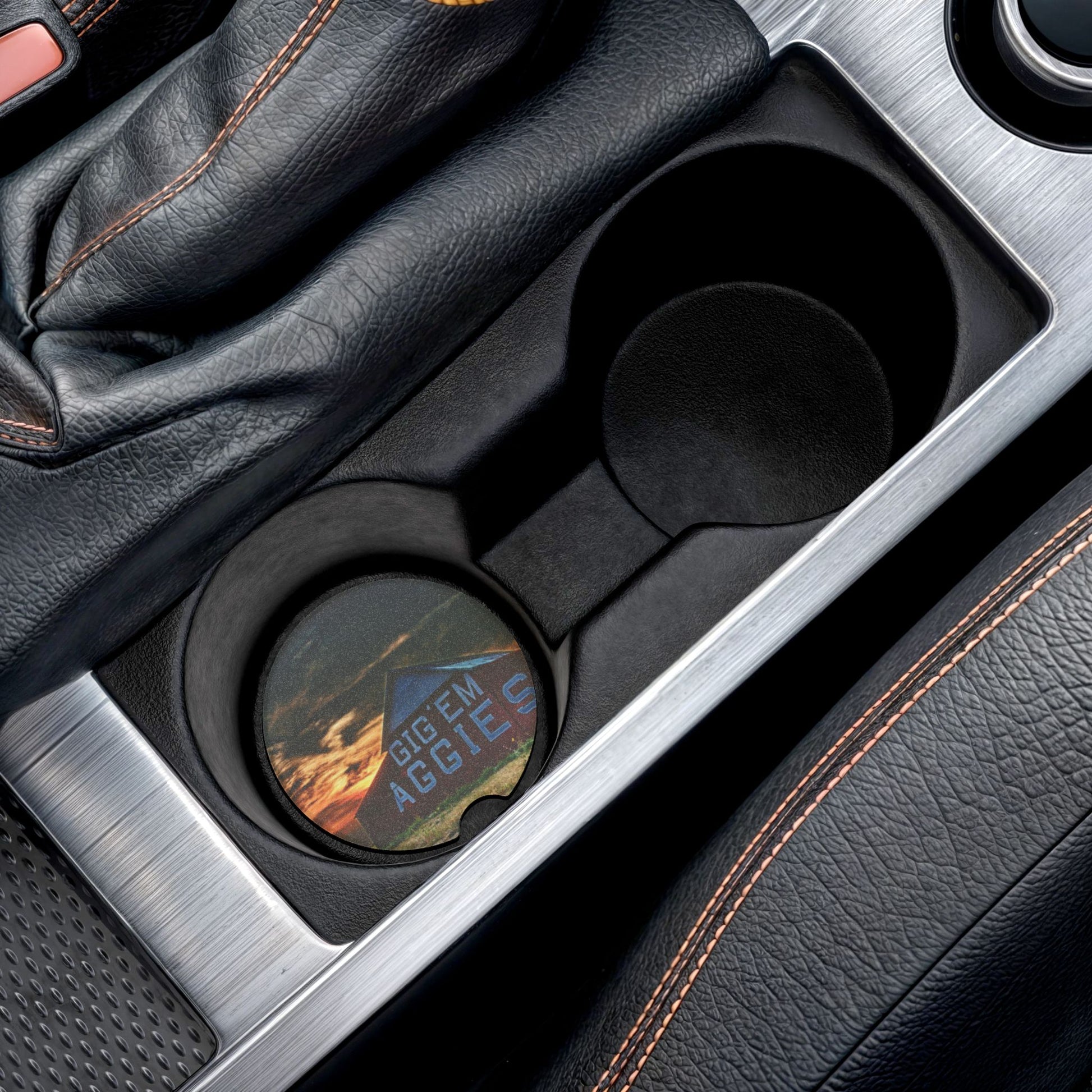 Bring a little slice of Texas pride to your ride! This absorbent ceramic car coaster features the beloved “Gig ’Em Aggies” barn at sunset — a fan-favorite landmark captured in warm, rustic tones. It’s the perfect way to keep your cup holders clean while adding a touch of maroon spirit to your everyday drive.