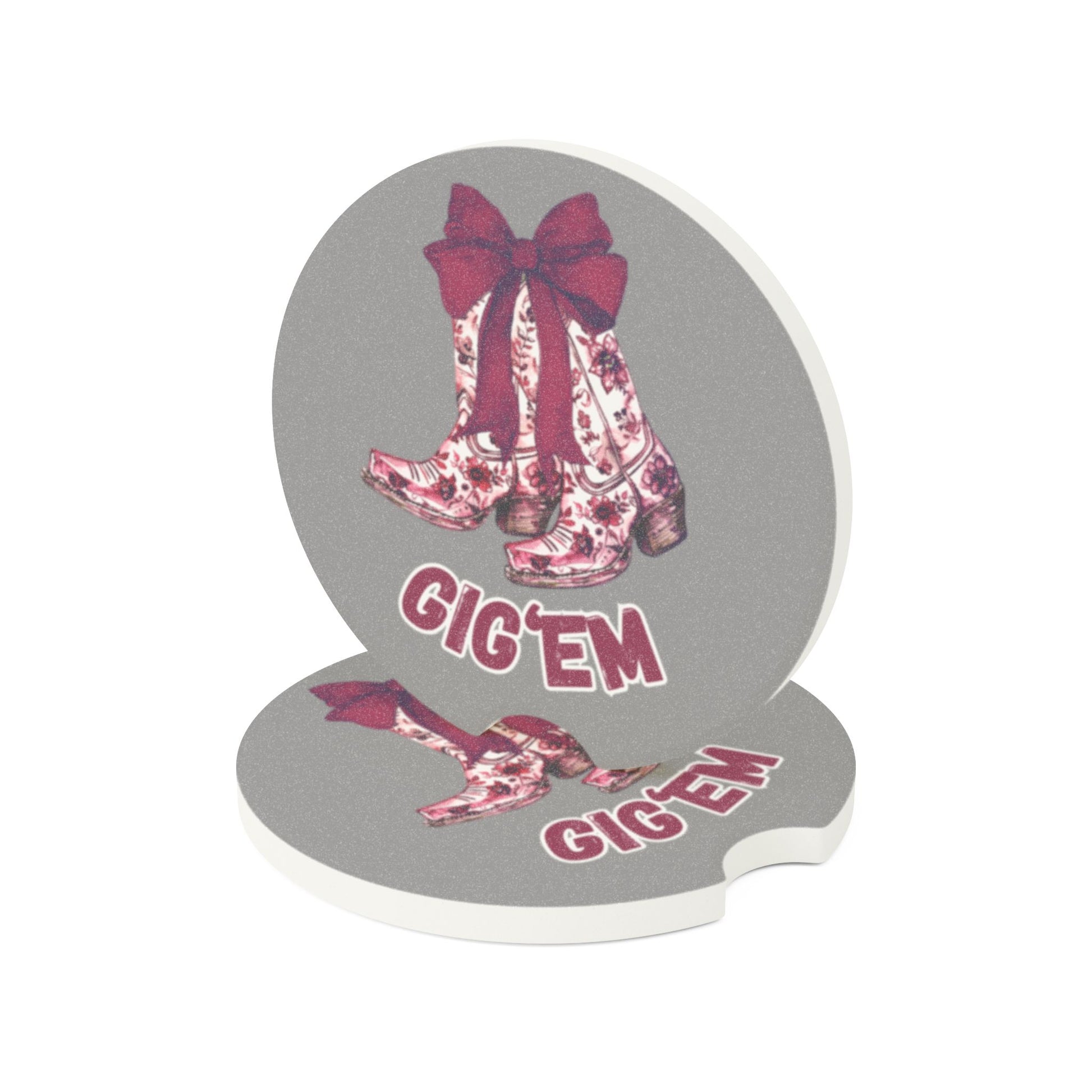 Aggies Boots Car Coaster – Soapstone Show your Aggie pride every time you hit the road with this Aggies boot-style car coaster! Made from absorbent soapstone, it keeps your cup holders clean while bringing that rustic Aggie charm straight from College Station to your ride. Whether you’re tailgating, heading to class, or just cruising around town, this coaster’s vintage barn design and bold maroon details make it a true fan favorite. 🤘🏼